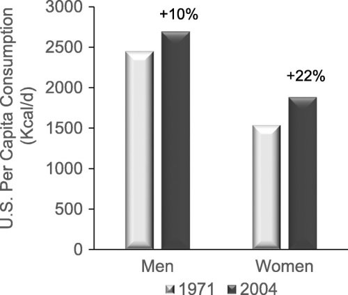 The verbal summary is from this article cited by the cited by the Nutrition Today authors: During 1971—2000, a statistically significant increase in average energy intake occurred. For men, average energy intake increased from 2,450 kcals to 2,618 kcals, and for women, from 1,542 kcals to 1,877 kcals. So men’s daily calorie intake went up by 168, and women’s by 335.